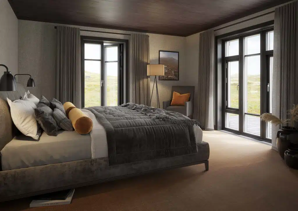 Illustrasjon av det ene soverommet i fjellhytta Nue til Halvor Bakke.